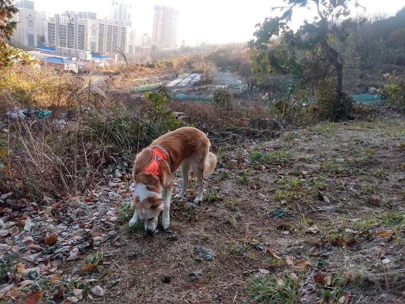 Us humans, we are in a sense (literally) caged. I spend a lot of time walking Viernes, our Guatemalan “chucho”, now here in Korea. She is a “smell the roses” kind of dog. I' want her to run and move fast with me but she’s always more interested in sniffing about.